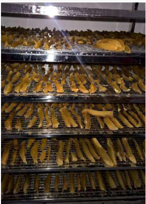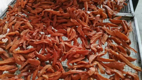 首先先將紅薯清洗干凈,然后將其進行蒸煮。在紅薯大約有七八成熟的時候將其取出,等到冷卻后再進行切片。在切片環節中,首先要保持厚薄一致,基本在2公分左右將合適,完成以上步驟,就可以將紅薯片放入物料托盤里了,做到厚度均勻,擺放整齊就可以了。